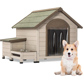 Medium Large Dogs Outdoor Natural Wood Pet House With Weatherproof Bowl Storage Box 41"L X 36"W X 32"H Cabin Style Dog House