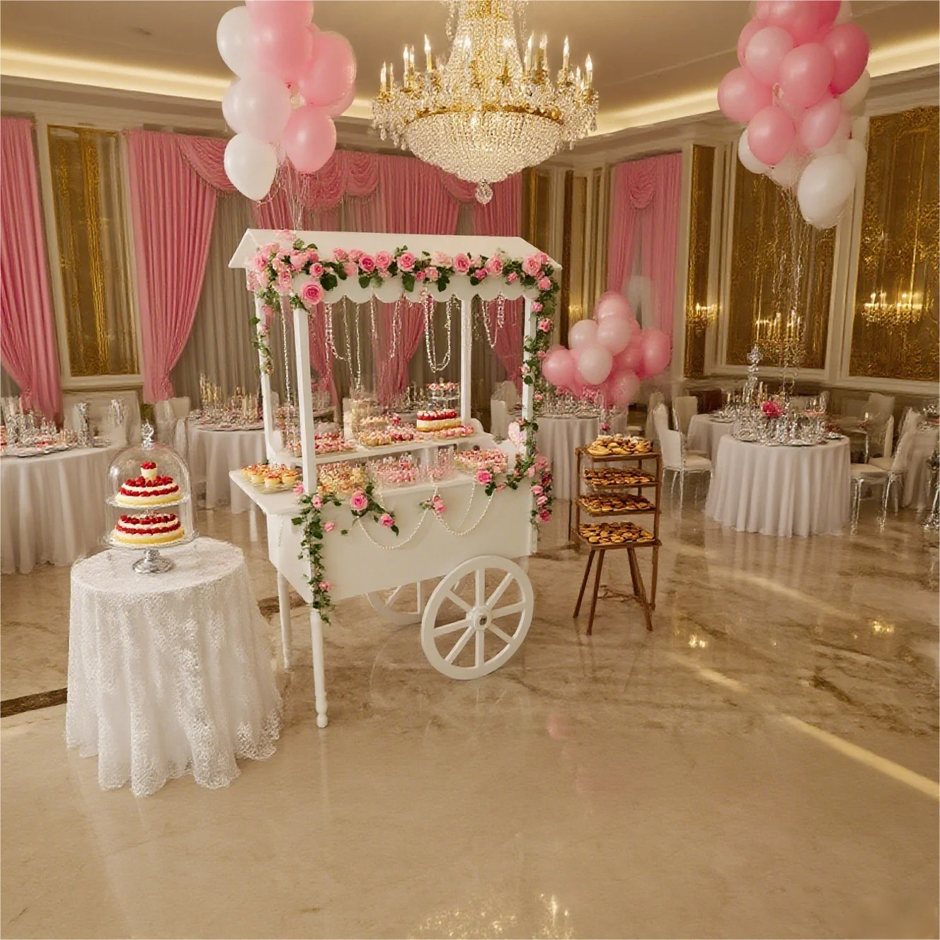 2025 Hot Sale Customized Wooden Pink Red Flower Candy Cart With Wheels for Wedding Christmas Dessert Party Cart